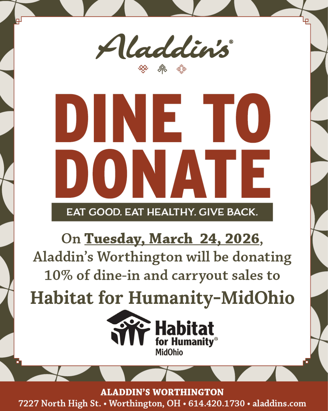 Join our Habitat Young Professionals chapter for a fundraiser supporting the Devon Triangle project! On Tuesday 3/24, Aladdin’s Worthington will be donating 10% of dine-in and carryout sales to Habitat MidOhio. Join us for good food for a good cause!